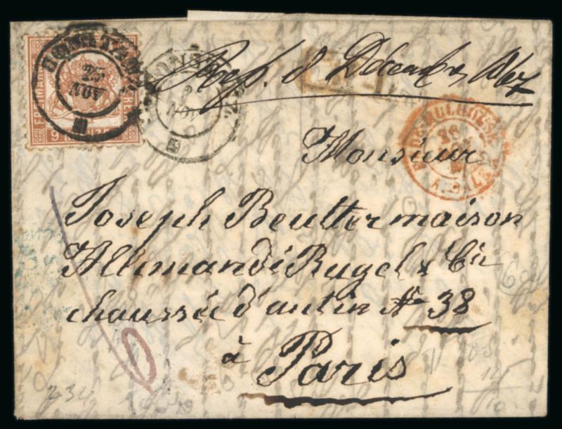 1860s group of covers, most to France with 1863 9kr brown mourning envelope, two 9kr dull red, 1868 mourning envelope to Wiesbaden with three 1k, 1867 entire to Paris via Basel and cover to Frankfurt, both with train transits, Z14 and Z19 plus 1867 3k and 6k outer letter sheet to Marseille, fair to fine condition. (Image)