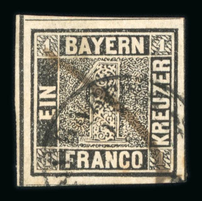 1849 1Kr palte I black with good large margins, at left with full dividing line and at top and right largely complete, plus traces even on bottom margin, used with part double ring Nurnberg date stamp, an extremely fine example, Franz Stegmüller Cert (2025) (Image)