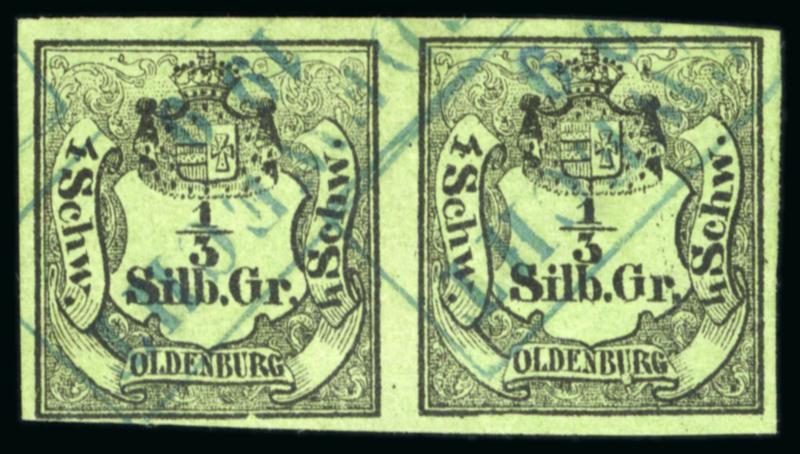1852 1/3 Sgr used pair with fine to large margins, neat Edewecht framed ds, very fine, signed Pfenninger (Mi. €3'500); ex Burrus. (Image)