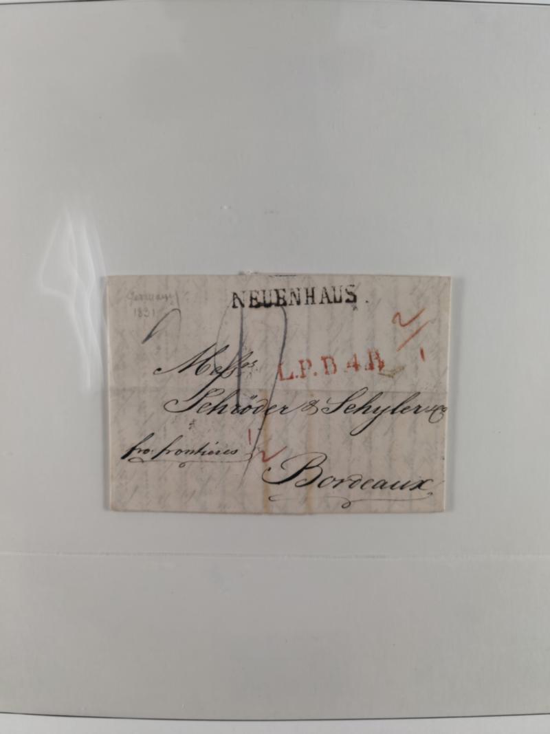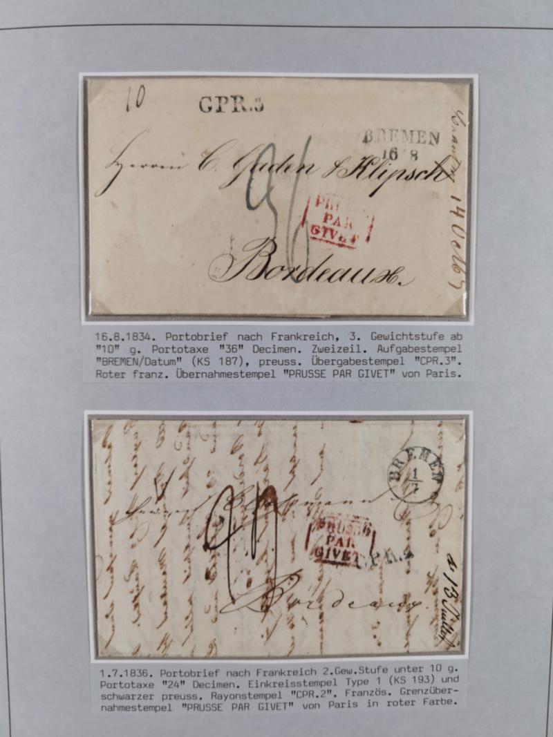 1769/1860 (ca.), interessante Partie von rund 60 vorphilatelistischen und unfrankierten Belegen, dabei diverse Stempeltypen, Transitstempeln, viele klare Abschläge, dabei u.a. 1854 Faltbrief nach USA mit seltenem rotem Transit-Stempel "48/18KrB. AMERICA ÜBER BREMEN usw., dazu Mi.-Nr. 10b auf Faltbriefhülle nach Bremerhaven (repariert, FA Neummann BPP), eine interessante Auswahl, meist in schöner Gesamterhaltung, sauber in 2 Alben