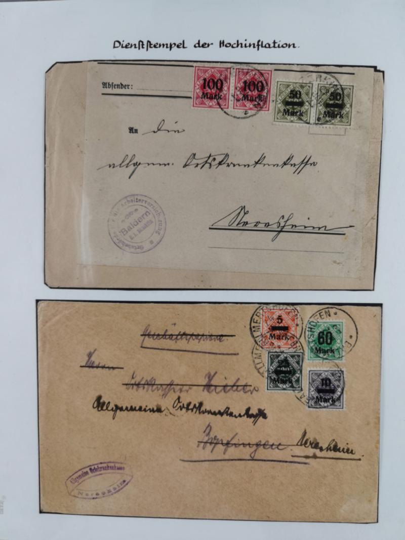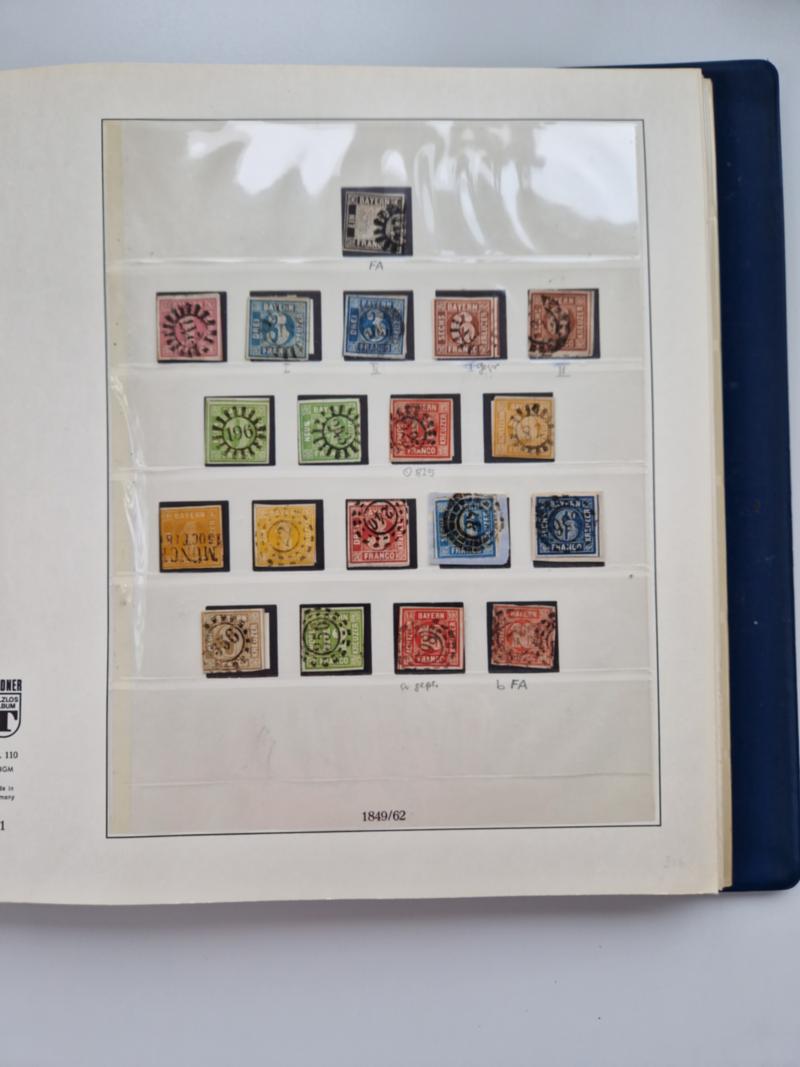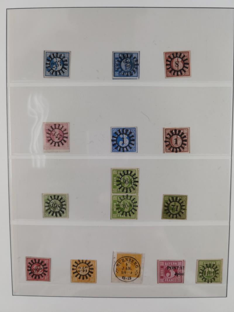 1849/1920, enorm reichhaltige, praktisch ausschließlich gestempelte Generalssammlung in 10 Bänden mit tausenden von Marken und hunderten von Briefen und Ganzsachen, oft sehr breit gesammelt mit vielen besseren Einzelwerten, vielen Einheiten, interessanten und teils umfangreichen Stempelteilen, Farb- und Mischfrankaturen, Auslandsbriefen, Bayern mit Zusammendrucken (auch auf Belegen), etc., etc. die Haltung ist sehr unterschiedlich, vieles fehlerhaft, aber auch viel gutes und optisch schönes Material enthalten. Einiges mit Altsignaturen, einige Befunde/Kurzbefunde.