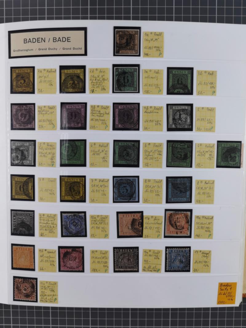 1770/1870 (ca.), umfangreiche und sehr lebhaft geführte Sammlung in elf Ringordnern mit losen Marken und klarem Fokus auf den zahlreichen Briefen, Karten, Ganzsachen und Postscheinen, etwas unterschiedliche Erhaltung von leicht fehlerhaft bis oft Pracht, ab Vorphilatelie mit seltenen Abstempelungen, Markenzeit mit u.a. Bunt- und Mischfrankaturen, Orts-, Nummern-, Uhrrad- und Postablagestempeln. Ein deutlich erkennbarer regionaler Schwerpunkt liegt bei Bruchsal und Umgebung, aber auch die anderen badischen Regionen wurden gesammelt.