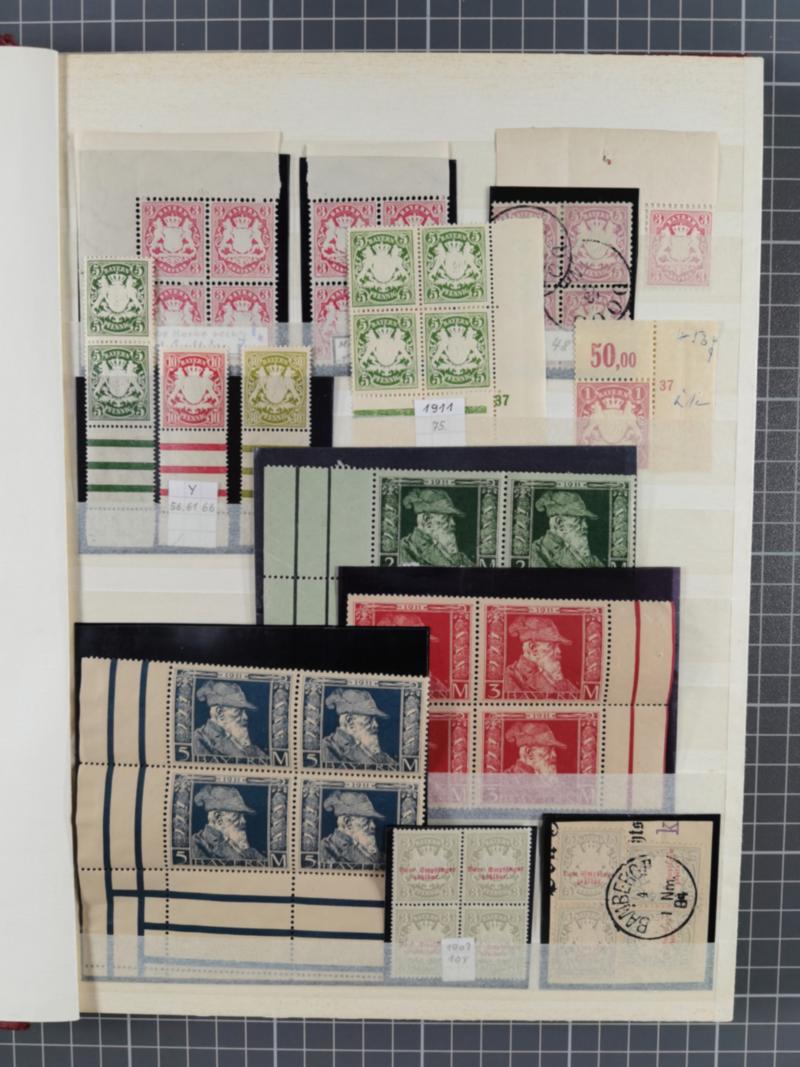 1849/1920, postfrische/ungebrauchte und gestempelte Sammlung mit vielen 4er-Blocks, Kehrdruckpaaren, Zwischenstegpaaren, sowie ferner Gummidrucken, kopfstehenden Aufdrucken und Probedrucken, dabei u.a. 18 Kr. Werte, Mi. 21d gestempelt (Befund Brettl BPP), 32c ZW postfrisch (KB Stegmüller BPP), Ludwig Friedensdruck mit u.a. 1 M. im 4er-Block mit Unterrand (sign. Dr. Helbig BPP), 20 M. aus der rechten oberen Bogenecke, sowie ungezähnt u.a. 2 M. im senkr. 6er-Block aus der rechten unteren Bogenecke (sign. Pfenniger), ferner Mi. 148-151 im kpl. Kleinbogensatz, Mi. D34 mit markanter Quetschfalte und verschobenem Markenbild, Probedrucke mit u.a. 80 Pfg. im 4er-Block auf chromweißen Papier sowie 1 ½ M. im 4er-Block auf gelblichem Kartonpapier, etc., ferner anderes, teils signiert, meist gute, in den Anfängen teils unterschiedliche Erhaltung, im Album