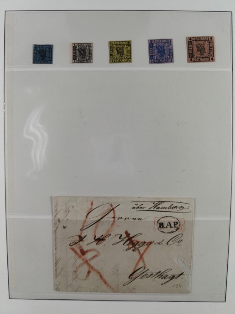 1840/67 (ca.), interessante Sammlung, mit 17 Briefen ab Vorphila, meist jedoch markenlose Briefe mit u.a. Landpostbrief aus Reppelhagen befördert mit Bierfahrer "Gütte” , EKr. Bergedorf auf Brief mit NDP Mi.-Nr. 4 nach Leipzig, Hamburg U11 nach Bergedorf gelaufen (sign. Grobe u. Jakubek), Brief mit Franchise "Le Maire d' Hambourg”, Brief mit handschriftlicher Entwertung "Hbg” des Bergedorfer Postamts in Hamburg (abgebildet in Knauer: "Bergedorf", ex A. Salm Teil II (Huys-Berlingin), rote Aufgabestempel, etc., ferner ein Postschein sowie Mi.-Nr. 1-5 ungebraucht (sign. Gebr. Genf), einige Stücke ex Sammlung A. Salm und Prof. Dr. Hornhues, einiges signiert., sauber im Album