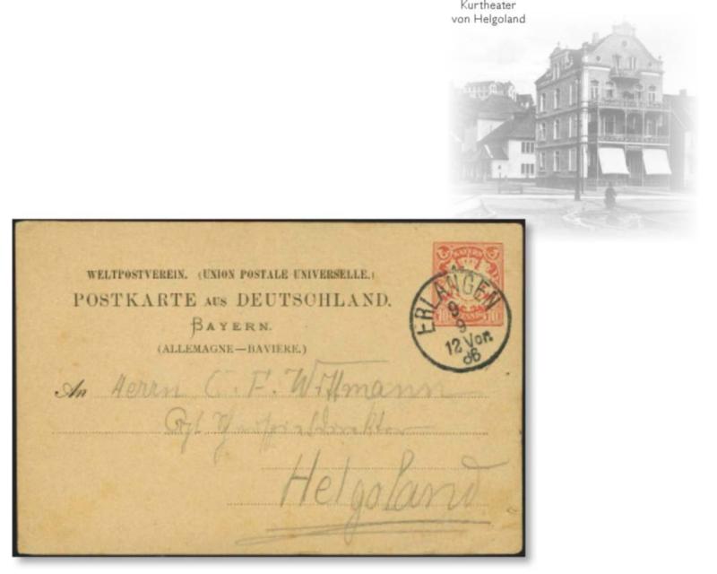Ganzsachenkarte 10 Pfennig rot ab "ERLANGEN 9 9 12 Vor 86”, adressiert an den Theater Director C.F. Wittmann auf Helgoland, der Text geschrieben von seinem Sohn "Liebe Eltern…nach sehr anstrengenden Marschmänover wohlbehalten hier angekomen…”, kleines Aufnadelungsloch, sonst tadellos