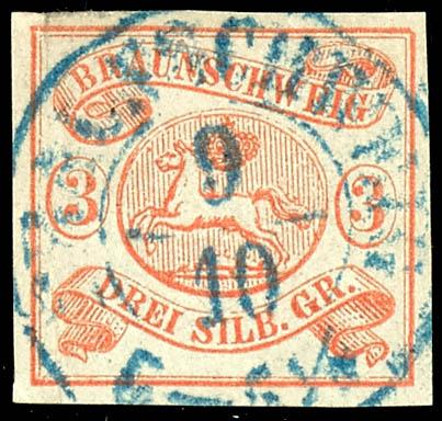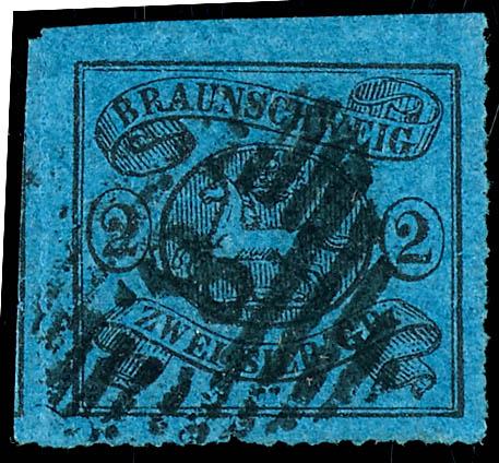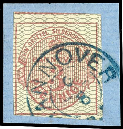 10 Groschen dark greenish olive, fresh colours and having full margins copy, cancelled by dual circuit cancel "HILDESHEIM", two diagonal creases as well little thins reverse no further defects, expertized, Walter Engel, PSGY, Thier, Alberto Diena as well photo expertize Michael Jaeschke Lantelme BPP (2024), Michel 1.700.- (18) Certificate
