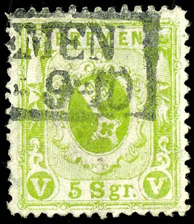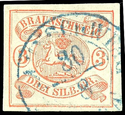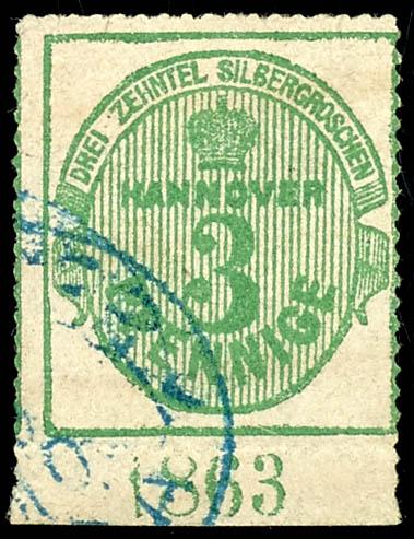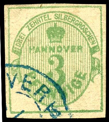 3 pennies green, having full margins extremely fine copy, cancelled by blue two ring cancel "Hanover", photo expertize Florian Berger BPP "perfect", Michel 1.200.- (20) Certificate