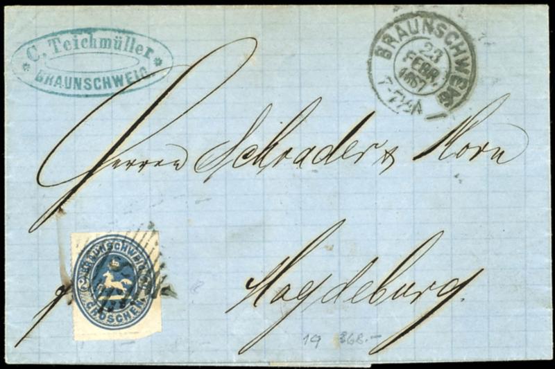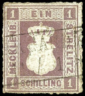 1 Shilling bull head in the coat of arms gray violet, cancelled by box cancel of 2 lines "STARGARD I / Meklbg. / 11 / 1 . ", fresh colours, corner left at the bottom added to, repaired tear above as well a thin spot place in the fold region, no further defects, genuine used very rare stamp, signed Thier, photo expertize Michael Jaeschke Lantelme BPP (2024), Michel 4.000.- (3) Certificate