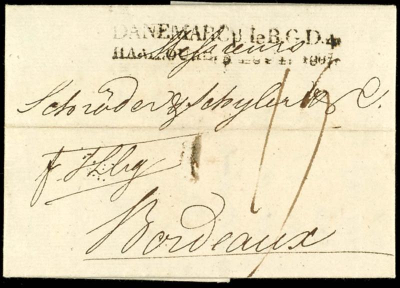DANEMARC P.LE B.G.D.4. HAMBOURG. .. AOUT. 1807, schwarzer Transit-L2 des Großherzoglich Bergischen Oberpostamts auf austaxiertem, vollständigem Faltbrief aus Copenhagen nach Bordeaux in aktenfrischer Luxus-Erhaltung (Feuser 265) (Image 1)(Image)