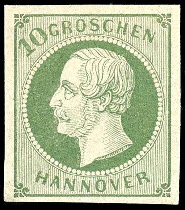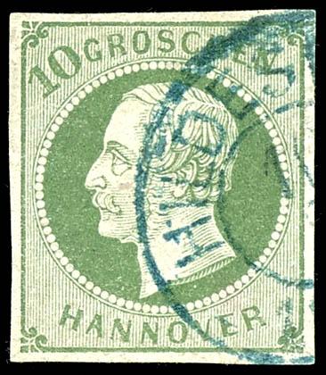 10 Groschen dunkelgrünlicholiv, farbfrisches und vollrandiges Exemplar, entwertet mit Zweikreisstempel "HILDESHEIM", zwei Querbüge sowie punkthelle Stellen rückseitig keine weiteren Mängel, geprüft, Walter Engel, PSGY, Thier, Alberto Diena sowie Fotoattest Michael Jäschke-Lantelme BPP (2024), Mi. 1.700.- (Image 1)(Image)