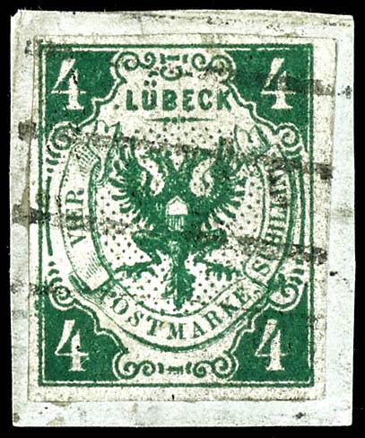 4 Schilling dunkelgrün, Wasserzeichen Blumen, allseits voll- bis breitrandig geschnittenes Exemplar, entwertet mit Fünfstrichstempel auf Briefstück, leichte Verschmutzungen sonst tadellos, Fotoattest Claus Heitmann BPP (2023), Mi. 750.- (Image 1)(Image)