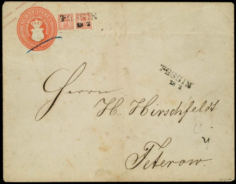 1 Silbergroschen Ganzsache im Format B mit Zusatzfrankatur 2/4 Schilling der Michel-Nr. 1 auf Brief von TESSIN nach Teterow, klarer schwarzer Zweizeiler "TESSIN 28 2", Umschlag minimal fleckig, geprüft Bühler (Image 1)(Image)