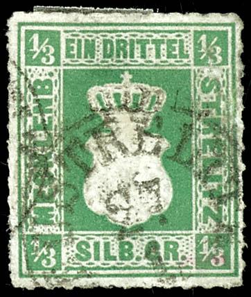 1/3 Silbergroschen lebhaftolivgrün, farbfrisches Exemplar, entwertet mit Einkreisstempel "NEUSTRELITZ 27 1", zwei ausgebesserte Stellen rückseitig sowie leichter Querbug mit kleinem Spalt links, sonst tadellos, echt gestempelt eine seltene Marke, Fotoattest Michael Jäschke-Lantelme BPP (2024), Mi. 1.700.- (Image 1)(Image)