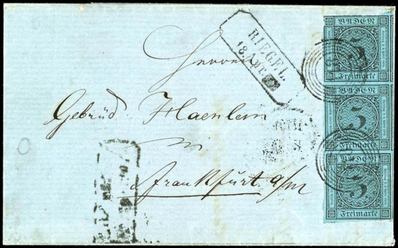3 Kreuzer auf lebhaftgrauultramarin, senkrechter 3er-Streifen auf portogerechtem Faltbrief mit 5-Ring "118" - RIEGEL 18 APR. (1859) nach Frankfurt mit Bahnpoststempel, der obere Wert links oben angeschnitten und oben auf der Randlinie geschnitten, das untere Markenpaar vollrandig, rechts über die volle Länge mit Teilen der Nebenmarken, sehr schön farbfrisch, mit vollem Inhalt, eine - insbesondere auf Brief - seltene Einheit, das Archiv der ArGe Baden hat nur etwas mehr als ein Dutzend Belege mit 3er-Streifen registriert, gepr. Englert BPP und Fotoattest Stegmüller BPP "... meist jedoch breit- bis weit überrandig. Ursprüngliche und farbfrische, ansonsten tadellose Erhaltung. Portorichtig frankierter Brief für die 3. Entfernungszone. Eine dekorative und nicht häufige Mehrfachfrankatur." - ex Slg. "Franconia" (Feuser, Stuttgart 2018)" (Image 1)(Image)