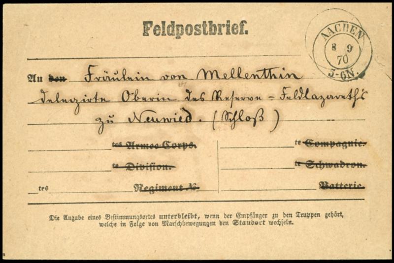 Frankreich-Feldzug, Vordruckumschlag FELDPOSTBRIEF ab ACHEN 8.9.70 nach Neuwied an "ELISE von MELLENTHIN, Delegierte Oberin des Reserve Feldlazaretts ..." in Neuwied, an eine freiwillige Helferin im Sanitätsdienst, geringe Spuren, ein früher und ausgezeichneter Vorläufer-Beleg zum Thema ROTES KREUZ (Image 1)(Image)