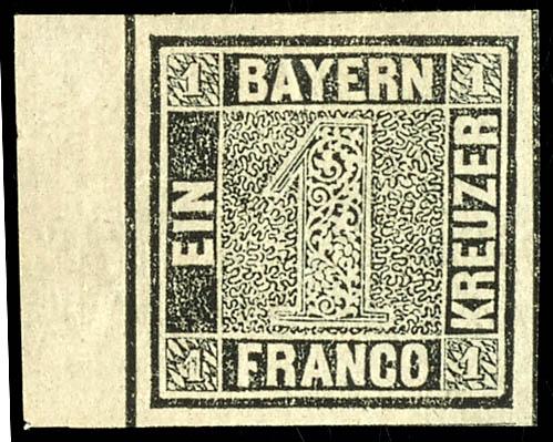 1 Kreuzer grauschwarz, Platte I, voll bis breitrandiges Kabinettstück vom linken Bogenrand (6mm), ungebraucht mit Originalgummierung, tadellos ungebraucht mit Originalgummierung und Falzresten, geprüft Brettl BPP und Fotoattest Peter Sem BPP "Hübscher "Schwarzer"-Einser in frischer Erhaltung." (Image 1)(Image)