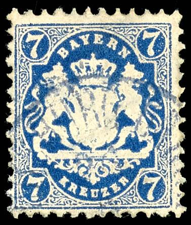 7 Kr. Coat of arms dark blue, watermark "wide lozenge", used faultless extremely fine copy the good colour, photo expertize Mary Brettl "genuine, perfect", Michel 220.- (25Yc) Certificate