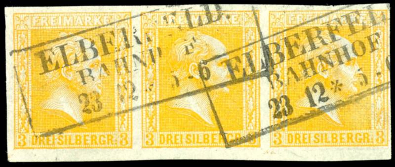 3 silver penny gridded ground yellow, full- to very wide margined horizontal strip of three, cancelled by box cancel of 2 lines "ELBERFELD railway station 23.12. ", very decorative extremely fine copy! (12b(3)) 3 Silbergroschen gegitterter Grund gelb, voll- bis sehr breitrandiger waagerechter Dreierstreifen, entwertet mit Ra2 "ELBERFELD BAHNHOF 23.12.", sehr dekoratives Kabinettstück! (Image)