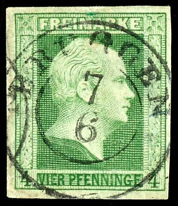 4 pennies green, having full margins and fresh colours outstanding quality, centrically cancelled with two ring cancel "BERGHEIM 4 / 4", expertized Drahn (5a) 4 Pfennige grün, vollrandiges und farbfrisches Luxusstück, zentrisch entwertet mit K2 "BERGHEIM 4/4", geprüft Drahn (Image)