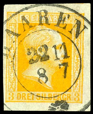 hair 22 11, (government Bez. Aachen), two ring cancel in special form with ornament piece, S.O.T.N on enormous margins extremely fine copy 3 silver penny yellow orange, smooth ground (8a) "HAAREN 22 11", (Reg.-Bez. Aachen), K2 in Sonderform mit Zierstück, klar und zentrisch auf breitrandigem Kabinettstück 3 Silbergroschen gelborange, glatter Grund (Image)