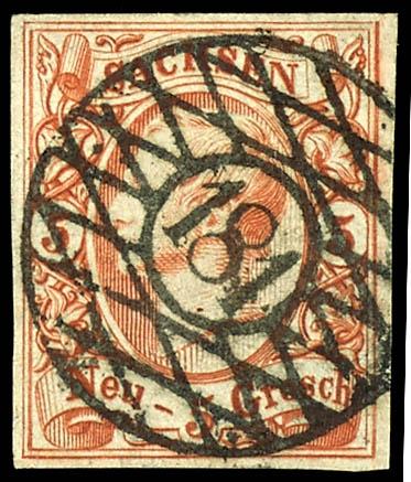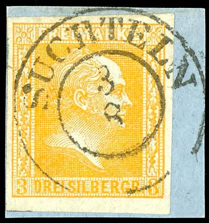 3 silver penny orange, smooth ground, thin, translucent paper, with enormous margins and fresh colours extremely fine copy, cancelled "KEMPEN on R. 9 / 4" (prephilatelic cancellation type), expertized Brettl BPP (8ax) 3 Silbergroschen orange, glatter Grund, dünnes, durchscheinendes Papier, breitrandiges und farbfrisches Kabinettstück, entwertet "KEMPEN a. R. 9/4" (vorphilatelistische Stempeltype), geprüft Brettl BPP (Image)