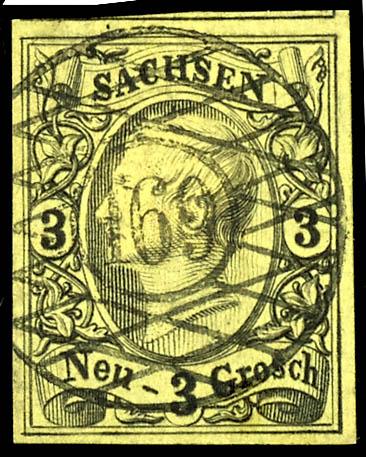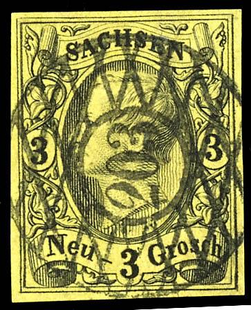 3 silver penny black on yellow, having full margins and fresh colours outstanding quality with on this issue rare town postmark cancellation "LOBBERICH 17 / 6" (4a) 3 Silbergroschen schwarz auf gelb, vollrandiges und farbfrisches Luxusstück mit auf dieser Ausgabe seltener Ortsstempelentwertung "LOBBERICH 17/6" (Image)