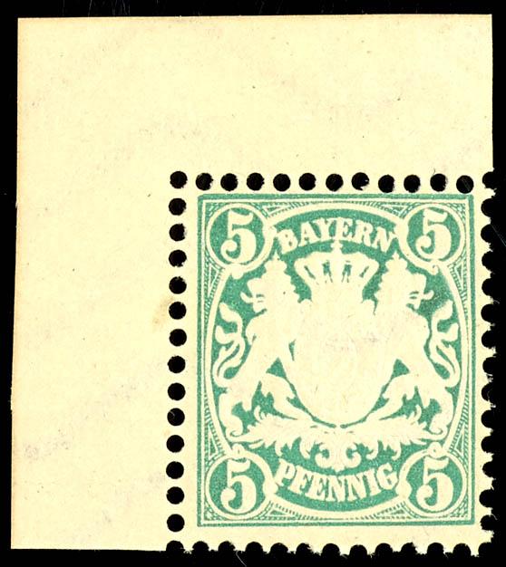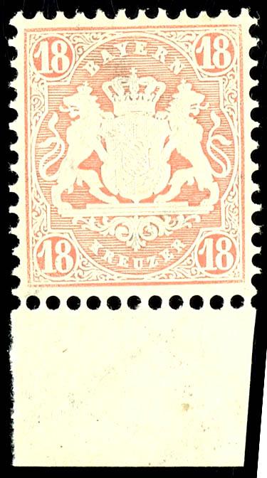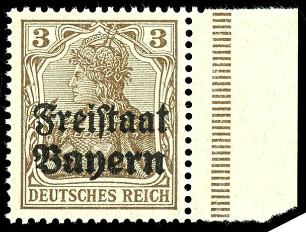 3 pfennigs Germania with overprint \Free State of Bavaria\, brown, from right margin of sheet, mint never hinged, very fine, expertized Bauer BPP, practically never offerd stamp, whose catalogue value the rarity not reflects. (137a) 3 Pfennig Germania mit Aufdruck \Freistaat Bayern\, braun, vom rechten Bogenrand, postfrisch, tadellose Erhaltung, geprüft Bauer BPP, praktisch nie angebotene Marke, deren Katalogwert die Seltenheit nicht widerspiegelt. (Image)