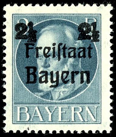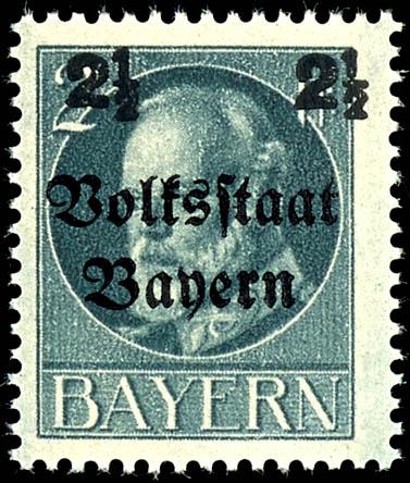 not issued: 2 1 / 2 on 2 pfennigs King Ludwig III. with overprint \Peoples State Bavaria\, mint never hinged, very fine, rare stamp (VIA) Nicht ausgegeben: 2 1/2 auf 2 Pfennig König Ludwig III. mit Aufdruck \Volksstaat Bayern\, postfrisch, tadellose Erhaltung, seltene Marke (Image)