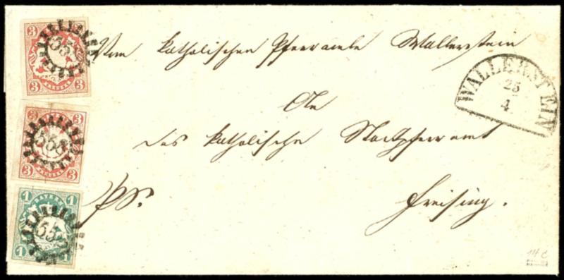 1 Kreuzer dark blue green in mixed franking 3 Kreuzer reddish carmine (2) on cover from \WALLERSTEIN 25 4\ with cancellation of the stamps through g Mr \558\, mailed to Freising with on the back arrival semicircle cancel from 28 4, expertized Pfenniger (14c,15(2)) 1 Kreuzer dunkelblaugrün in Mischfrankatur 3 Kreuzer rötlichkarmin (2) auf Brief von \WALLERSTEIN 25 4\ mit Entwertung der Marken durch gMr \558\, gelaufen nach Freising mit rückseitigem Ankunfts-HK vom 28 4, geprüft Pfenninger (Image)
