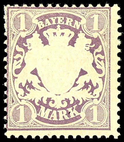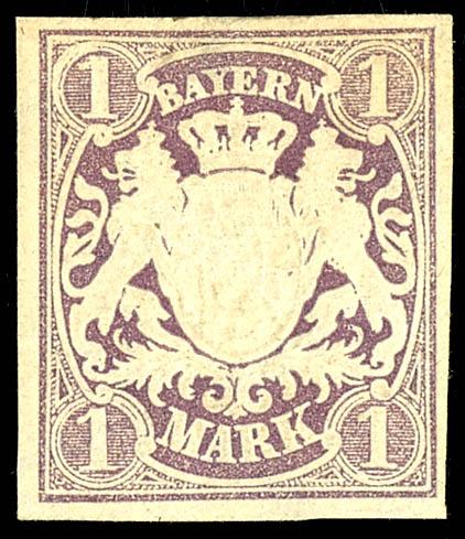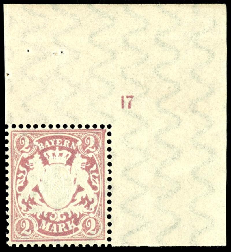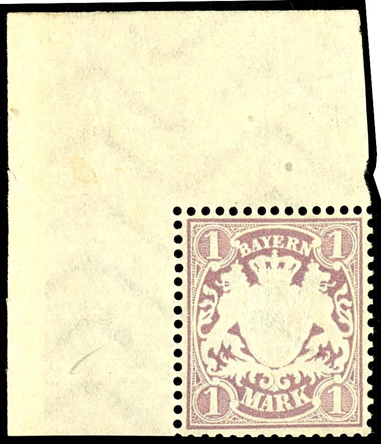 1 Mark violet, watermark far Wave, corner margin piece top left, fresh colours and clear embossment, the perforation at the lower margin slightly trimmed and through it shortened, mint never hinged - in this condition very rare stamp, very fresh piece, photo expertize Dr. Helbig BPP, Michel 5.000.- (43) Certificate 1 Mark violett, Wasserzeichen weite Welle, Eckrandstück oben links, farbfrisch und klare Prägung, die Zähnung am Unterrand etwas beschnitten und dadurch verkürzt, postfrisch - in dieser Erhaltung sehr seltene Marke, sehr frisches Stück, Fotoattest Dr. Helbig BPP, Mi. 5.000.- (Image)