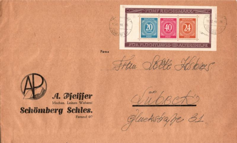 1946, Allied Zones, Stamp Exhibition Perf. and Imperf. blocks on 2 covers, canceled ‘Berlin 11.12.46. + Waldenburg’ ‘5 RM. for Refugees and Elderly Homes’,. Mi. Bl. 12a +12b. 400€ (Image)