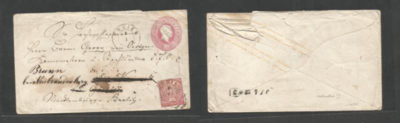 German States-Baden. c. 1868 (4 Jan) Heidelberg - Endien, where forwarded with NGF 1gr rose tied cds to Brunn, bei Neubrandenburg 3 kr rose stat env. Rare combination of two diff States. (Image)