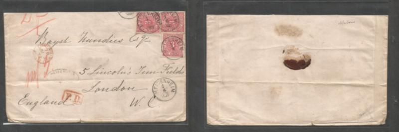 German States-Wurttemberg. 1872 )1 June) Heidenheim - UK, London (30 June) Multifkd env at 3 kr red perce (x3) 9k rate tied cds + arrival alongside. Fine. (Image)
