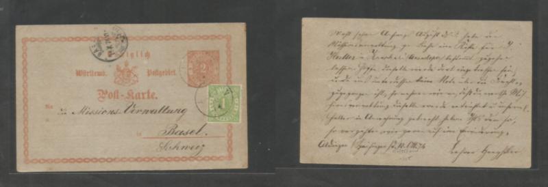 German States-Wurttemberg. 1874 (13 Oct) Aldingen - Switzerland, Basel (15 Oct) 2kr orange stat card + 1 kr green adtl, tied cds + arrival alongside. VF. (Image)
