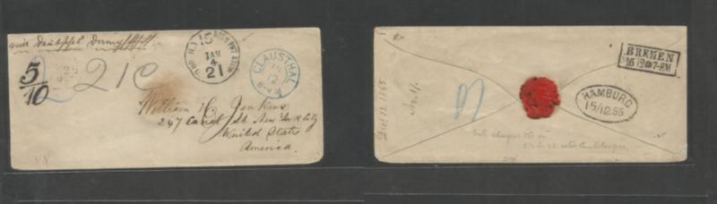 Germany Stampless. 1865 (14 Dec) Claustbal - USA, NYC. Stampless via Bremen envelope usage, with German + US (21c) charge + NY (Jan 6) 15c Bremen Packet entry maritime cachet. VF via Hamburg. Reverse transited. (Image)