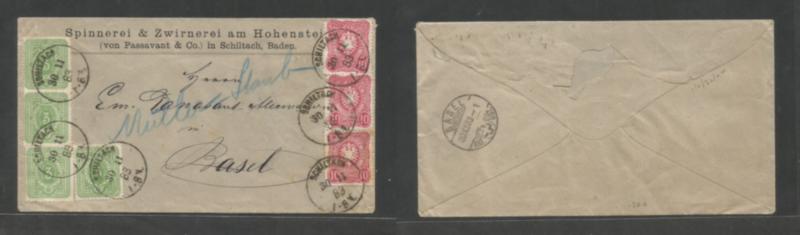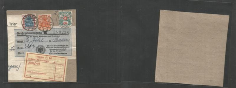 Germany 1921-4. 1921 (10 June) Trier - Switzerland, Baden (11 Feb) Multifkd package front + taxed + German + Swiss customs labels, arrival Swiss p. dues, tied. Fine multiple usage. (Image)