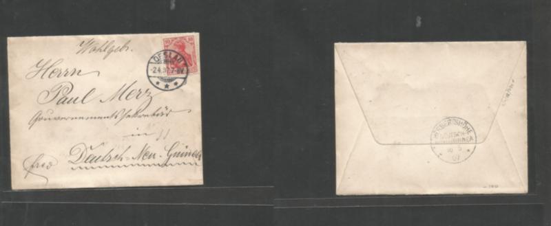 Germany - Xx. 1897 (2 April) Oeslau - German New Guinea (16 May) fkd 10 pf red single Germania envelope. A rare mere 44 days travel + destination at this early days. Nice condition + arrival cds at reverse. (Image)