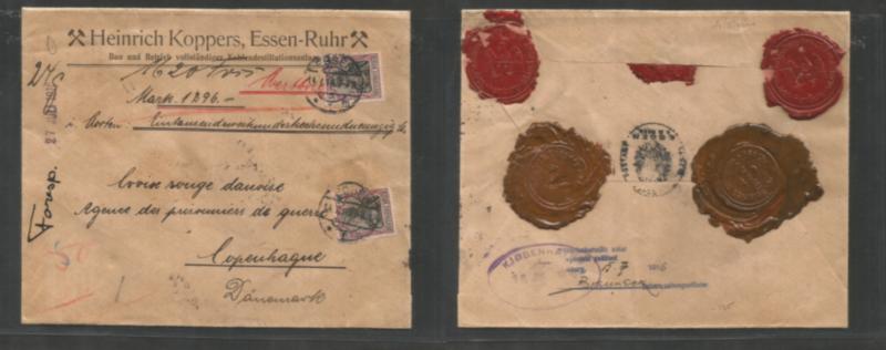 Germany - Xx. 1916 (14 July) Essen - Denmark, Cph (16 July) WWI multifkd registered insured 1,296 mark envelope, reverse red wax seals, Danish red cross. The scarce value postal service. (Image)