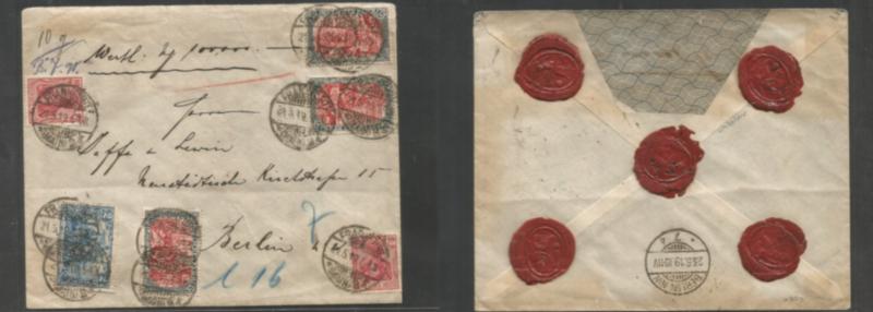 Germany - Xx. 1919 (21 May) Frankfurt - Berlin (23 May) Registered INSURED small envelope with staggering 17,20 marken rate. Value 100,000 with (3x) 5 marks stamps + 2 marks included value stamps with TWO cds cancels as by postal instructions to avoid fraud. Reverse five wax seal. XF. (Image)