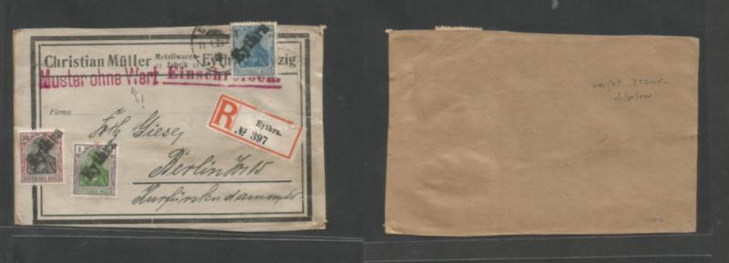 Germany 1921-4. 1921 (Apr 11) Eythra - Berlin. Registered multifkd package front at 2,10 marken rate, cancelled town name stline + R-label + cds alongside. Samples without value. Fine usage + scarce. (Image)