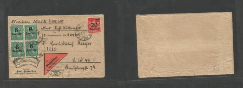 Germany 1921-4. 1923 (19 Sept) Berlin - SW47 local multi inflation fkd env, reimboursemet for a rare 6r millones marken, illustr env + orange label. Scarce 10cm service in this period. (Image)