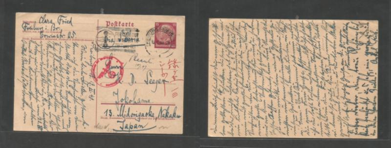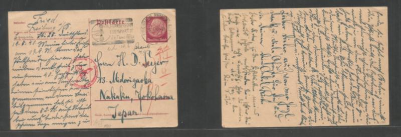 Germany - Xx. 1940 (12 June) WWII. Freiburg - Japan, Nakako, Yokohama (10 July) Single 15pf stat card, slogan tel cachet, nazi censor. Arrival Japanese annotation via Siberia endorsed, Russian air mail via Moscow. Extraordinary rare eastwards dest mail, hardly seen in this direction. 28 days travel. (Image)