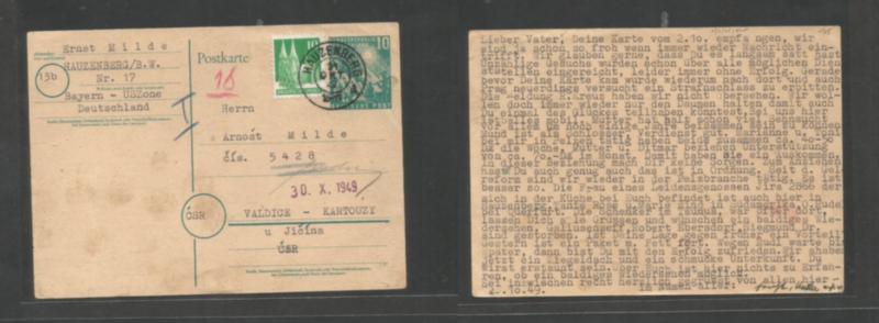 Germany - Xx. 1949 (20 Oct) Hanzenberg, Bayern - Czech Republic (30 Oct) Valdice - Kartouzi, Labor internment camp (30 Oct) 10pf green + adtl, tied cds stat card. Fine used. Kgl - Lager. (Image)