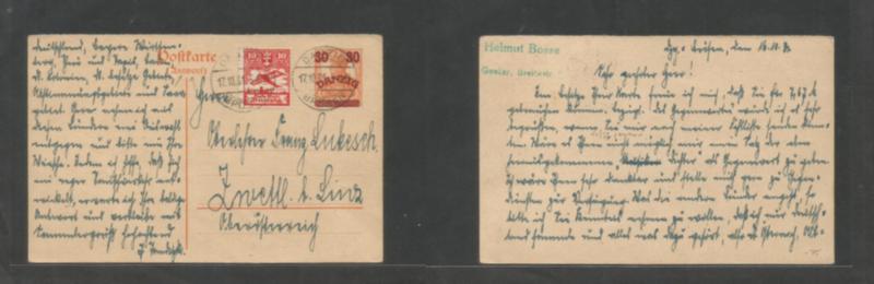 Germany - Danzig. 1931 (17 Oct) Reply card usage. Brusen, Golslar - Linz. 30pf ovptd Germania stat card + adtl air post strip, tied cds. Fine scarce p. history item. (Image)