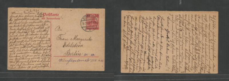 Germany - Danzig. 1932 (10 Febr) Doble stat card on way out. Zeppet - Berlin, Germany. 30c red ovptd Germania stat card. Fine. (Image)