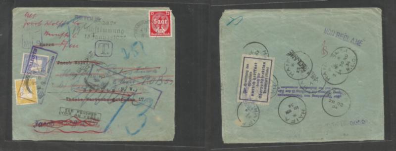 Sarre. 1934 (4 Oct) Saar Ahstinmung (13 Jan 35) Frankfurt - Berlin, fwded Palestine, Haifa (28 Nov) Fkd local envelope + fwded overseas + taxed + arrival (x2) p. dues tied cds + cachet. Reverse well transited. Interesting historical item of early Jewish leaving Germany. (Image)