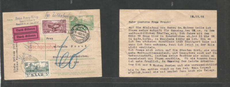 Sarre. 1955 (13 Dec) Saarbrucken - Germany, Stuttgart (16 Dec) 12fr green stat card + 2 adtls, tied cds + "Eilboten" doble pink labels + taxed + due mns "60". Fine + scarce. (Image)