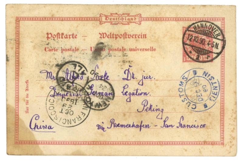 1896 Germany (12 Oct) to German legation in Peking via San Francisco. German 10pf PSC, tied by Hannover cds. Transit New York (24 Oct) with PAID ALL h.s., San Francisco (29 Oct), Customs Tientsin (9 Dec) with cds in violet. Scarce and peculiar.