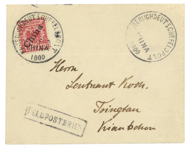 1900 German military cover from Tangku to Tsingtau, f.w. Eagle stamp ovpt. China diagonally 10of, tied by scarce "KAISERLICH DEUTSCHE FELDPOST / CHINA / 1900" ciruclar seal, alongside with "FELDPOSTBRIEF" h.s. Arrived Tsingtau German PO (30 Aug).