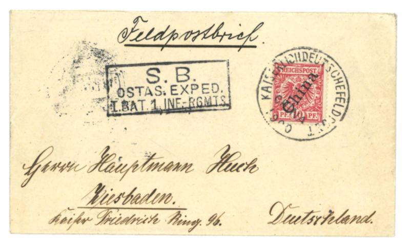1900 German military cover from SMS Jaguar, Tangku to Germany, f.w. Eagle stamp ovpt. China 10pf, tied by "KAISERLICH DEUTSCHE FELDPOST / CHINA / 1900", alongside wiith "S.B. OSTAS.EXPED. I BAT. 1. INF.-RGMTS" cachet. Arrived Wiesbaden (18 Oct).